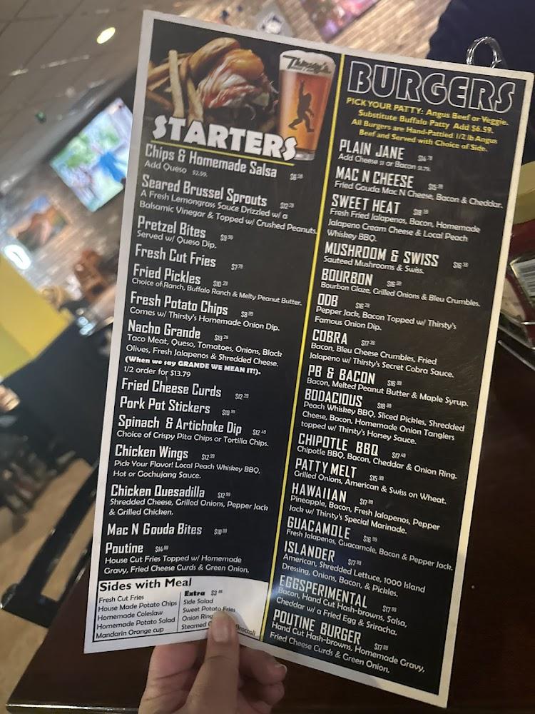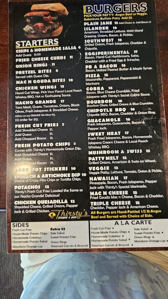 Thirsty's menu is a treasure trove of American favorites. Burgers are a highlight, from classic options to creative variants like the Hawaiian burger. Local specialties include the sirloin chislic and Indian tacos served on fry bread. The appetizer section offers a combination of flavors, featuring wings, mini tacos, and loaded nachos.